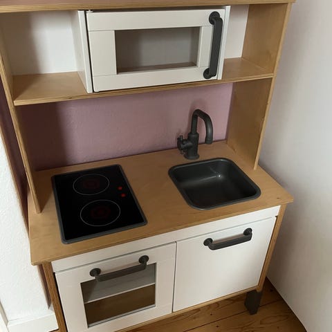 IKEA børnekøkken i træ med hvid og naturfarvet finish