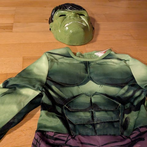 Hulk unisex kostume bestående af en grøn muskeloverdel og tilhørende lilla bukser. Str 128