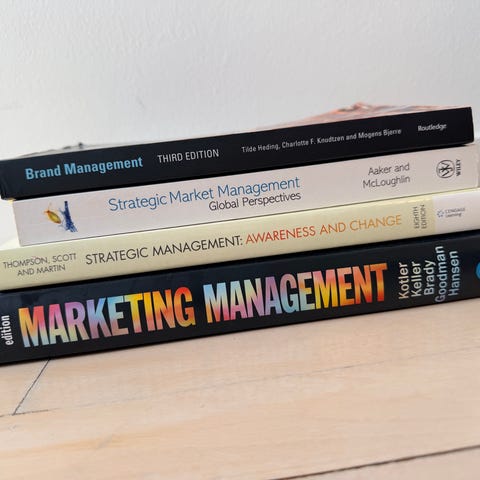 Alle bøgerne er stortset ubrugte - den eneste bog der har lidt mærker er “organisation”, som kan ses på billedet med kaffe mærker - dog kan der ikke ses noget inde i bogen.