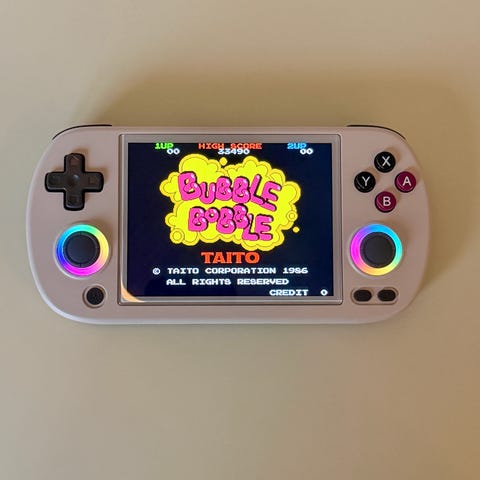 Konsollen leveres med 128 GB SD-kort, som er fuldt opsat og fyldt med spil, så den er klar til brug med det samme. Perfekt til retro-gaming på farten.