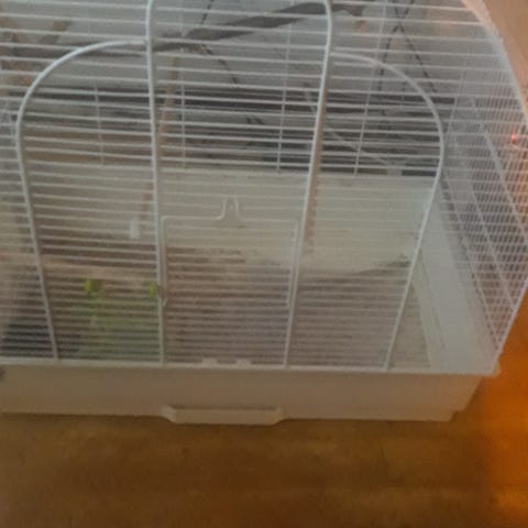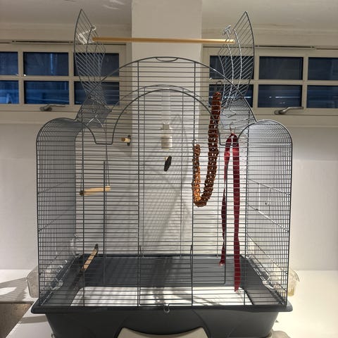 Måler 60 cm. i diameter, det brugt, men flot som nyt, sort net/gitter, cremefarvet base, 3-benet stander af solid bambus 40 cm. samlet 95 cm. højt, inc. nat-afdækning i midnatsblå, 2 x fuglebad, ekstra siddepinde, 2 gynger og en stige mm