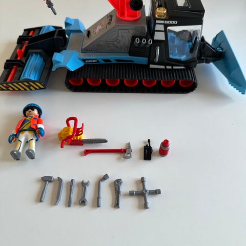 Playmobil gravemaskine med bevægelige dele, inkluderer en figur med hjelm og ekstra tilbehør som motorsav og en lille rød maskine. Farverne er primært sort, blå, rød og grå. Legetøjet er designet til børn og består af plastmateriale.