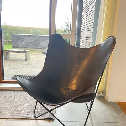 Flagermusstol i cognacfarvet læder med smuk patina. Der er enkelt mærker (se billede), men lægger man ikke mærke til med et skind i. Knirker ikke.