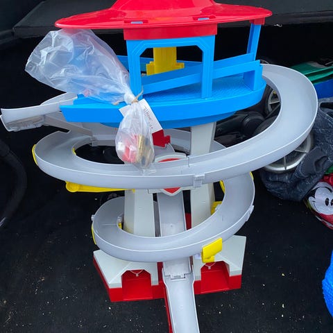 Paw Patrol legetårn med rutsjebane, fremstillet i plast med farverne rød, blå, gul og grå. Legetårnet er designet til børn og indeholder forskellige elementer til leg og fantasi.