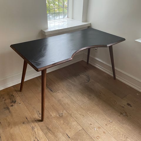 Flot skrivebord med top i olieret valnød finér, ben i massiv olieret valnød og front i valnød.