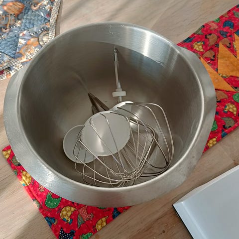 Bosch MUM5 køkkenmaskine med rustfri stål skål. Maskinen har flere tilbehørsdele til blanding, æltning og piskning. Designet til brug i køkkenet til forskellige madlavningsopgaver.