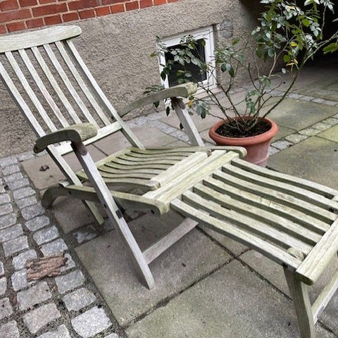 Dækstolene er i fin stand. Vi har forsøgt at fjerne malingen, idet vi synes, at de er pænest uden maling, men det vil være meget let at smøre dem ind igen, hvis det ønskes. De kan i øvrigt sagtens holde til at stå ude uden behandling. Sælges kun fordi vi ska flytte til mindre bolig, hvor der ikke er plads til vinteropbevaring. Prisen er for de to stole incl. hynder. Skal afhentes i Vejle.
