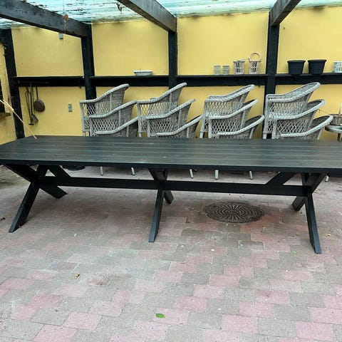 Sort havebord med tilhørende 6 sorte stole fremstillet i fletmateriale. Stole har armlæn og grønne hynder medfølger. Bordpladen er sammensat af planker med en smelteskade midt på