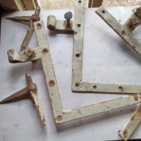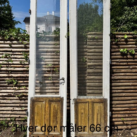 Gamle vinduesrammer og dobbeltdør i træ. Størrelsen står på glasset. Trænger til maling, men træ i god stand......ingen råd.