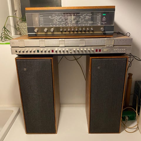 Vintage/ retro Bang & Olufsen Beomaster 900 radio med træfinish og metalfront. Begge højtalere virker, men en af dem har brug for en kærlig hånd. Der er et mærke øverst, fra hvad jeg mistænker er en potteplante. (Jeg er ikke sikker, da jeg selv har arvet radioen)