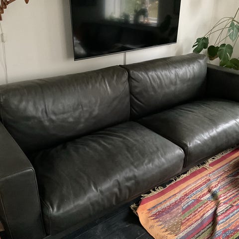 Sofaen er købt vintage men fremstår i flot stand uden synligt slid udover naturlig patina, som blot giver sofaen en lækkert look og har blødgjort læderet lidt så den er komfortabel at sidde i.