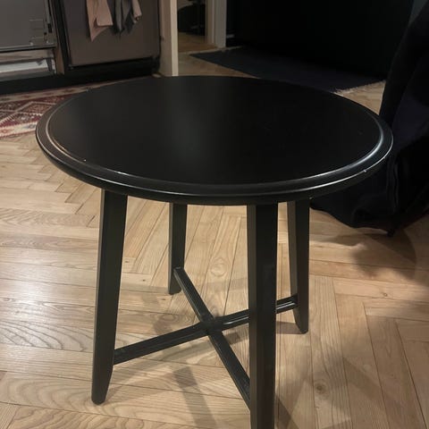 Sidebord / lampebord med glasplade fra IKEA. Har tydelige brugsspor som ridser, skrammer og vandskader. Vi har brugt det som lampebord med dug over. Afhentes i Glostrup.
