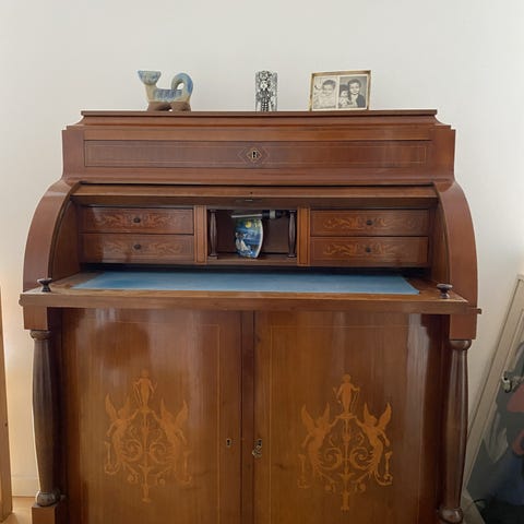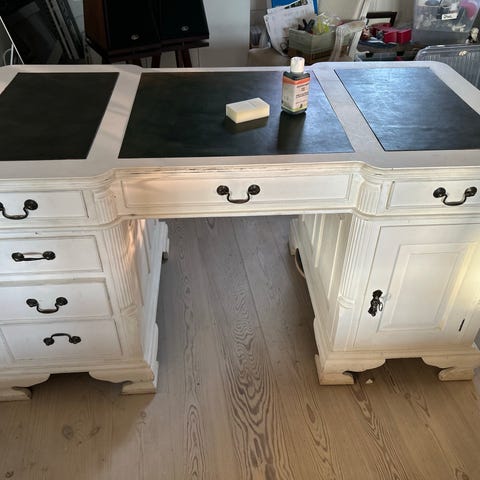Antik skrivebord med grøn læderoverflade og matchende læderstol