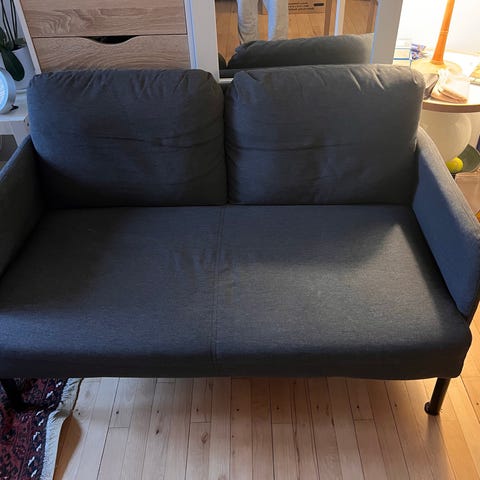 2 personers sofa sælges billigt grundet flytning. Den har små pletter (som afbilledet), men fejler intet. Er ikke forsøgt renset. Skal helst hentes mellem 31.1 og - 2.2, men andet kan arrangeres.