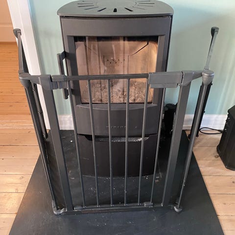 Pejseskærm designet til at placeres foran en pejs for at beskytte mod gnister og aske. Trænger til en rengøring.