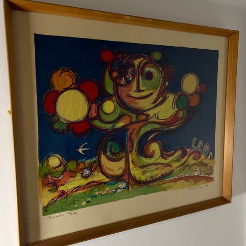 Knud Jans litografi med titlen "Mostar" fra 1976. Nummereret 22 ud af 25 eksemplarer. Motiv med abstrakte former på blå og turkis baggrund.