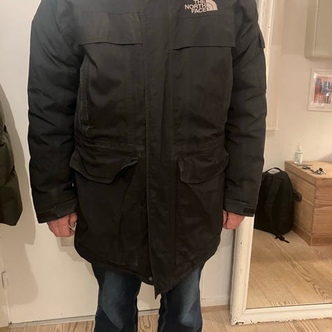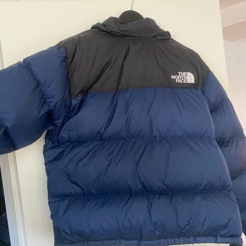 The North Face vinterjakke til herre i størrelse M. Jakken er blå og lavet af dun, hvilket giver isolering og varme. Jakken har en hætte med kunstig pelskant og er designet til udendørs brug i kolde temperaturer.