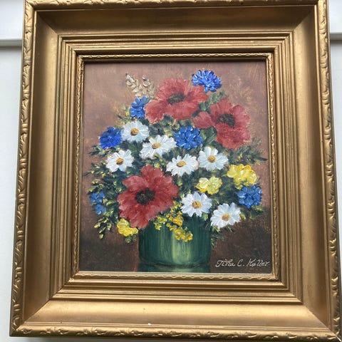 Tina C. Møller maleri med motiv af blomster i en lilla vase. Maleriet har et farverigt blomsterarrangement med hvide, lilla og røde blomster. Baggrunden er grøn.