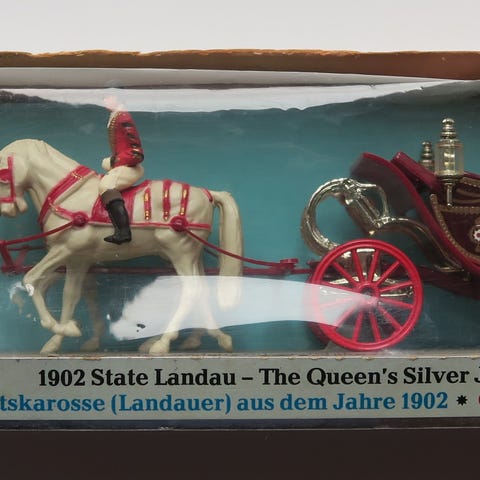 Miniature karet i vist nok bronze, meget detaljeret udført. Fungerer fint dvs alle 4 hjul kører frit rundt.