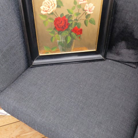 Lille oliemaleri med blomster motiv i en sort ramme billedet måler ca 38 x 32 med ramme