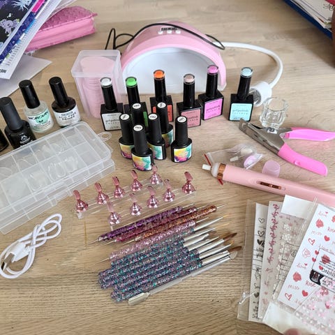 Gelpolish sæt med LED lampe, indeholder flere farver neglelak fra nailster og normal, top coat, base coat og tilbehør til neglepleje. Brugt ganske lidt. Sættet kan bruges til at lave gelnegle med lang holdbarhed. Rummer ikke neglesaks, fil, neglebåndsskubber.