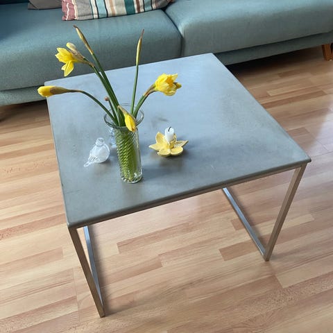 Super flot sofabord fra Bolia i travertin - bordplade i farven sand og stel i creme lakeret stål. Nypris 13.799kr.