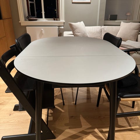 Et spisebord i hvid laminat og massive ben i eg. 115cm i diameter.