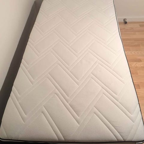 Jysk sengemadras med polstret overflade og træramme. Madrasens overflade er hvid med quiltet mønster, og bunden består af trælameller. Egnet til brug som enkeltseng eller gæsteseng.