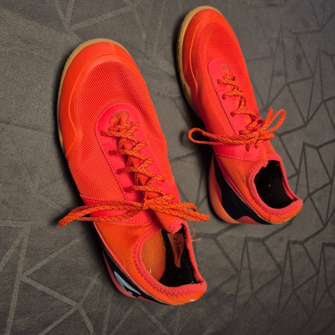 Asics indendørssko i størrelse 39,5 med sort og orange farvet design. Skoene er velegnede til fodbold og håndbold og har en gummisål, der giver greb på underlaget.