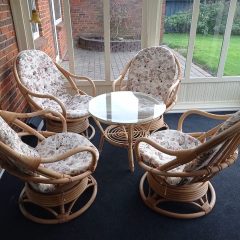 Bambus loungesæt / rotting – 4 stole + rundt bord med røgfarvet glas. Stabilt og velholdt, ingen skader på glas. Perfekt til sommerhus, udestue eller altan.