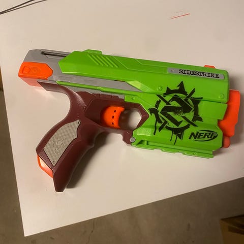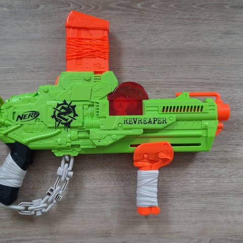 Nerfgun revreaper der følger 11 skud med. Den larmer lidt når man bruger den, men det skal den gøre da der er tandhjul. Den kan skyde hurtigt i forhold til der ikke er mulighed for batterier. Sælges da den ikke længere bruges.