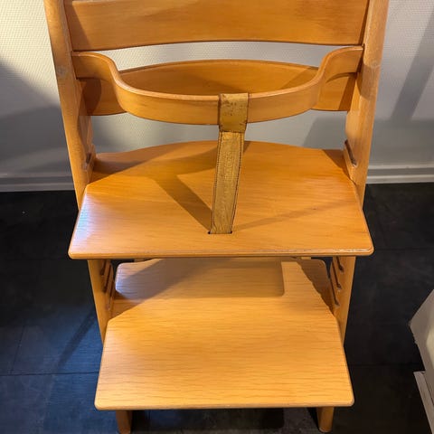 Stokke Tripp Trapp højstol i træ. Højstolen har justerbar sidde- og fodplade, hvilket gør den velegnet til børn i forskellige aldre. Materialet er træ med en naturlig finish.