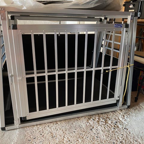 Aluminium hundebur DOGGY 45 med gitterdør og sort bund. Buret er konstrueret i aluminium med en bund i sort materiale. Det har en gitterdør for ventilation og adgang. Samt en nødudgang Egnet til transport eller opbevaring af hunde.købt sommeren 2025