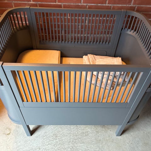 Sebra baby og Juniorseng i hvid farve. Kan bruges til baby, hvor den også kan hæves, så de ligger tættere på den voksne seng. Senere kan den trækkes ud til junior seng. Tillægs madras medfølger, dog med en plet som på billede (ikke forsøgt fjernet)