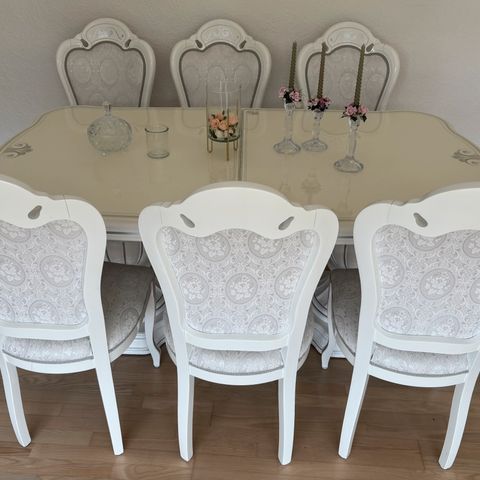 Sælger spisestuesæt bestående af spisebord med fransk udtræk samt 5 stole.