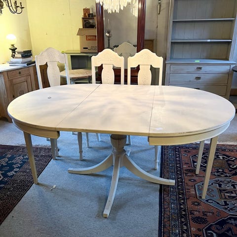 Spisebord m. fransk udtræk + 5 stole (129/221 cm)