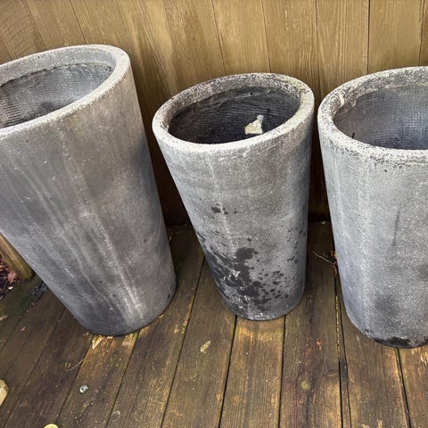 To rektangulære plantekasser i rustikt design, formentligt af beton eller cement.