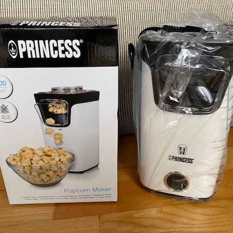 En popcornmaskine med et rødt låg og et klart plastikhus. Designet til at poppe popcorn ved hjælp af et varmeelement og en indvendig rørformet mekanisme. Udstyret med et håndtag og en dør til påfyldning og tømning. Velegnet til hjemmebrug til popcornfremstilling. Brugt kun én gang.