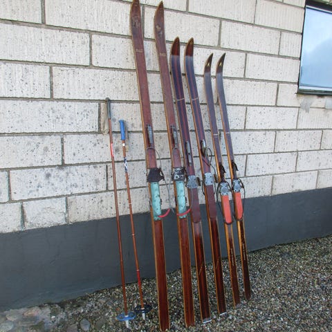 Skiene er ca. 160 cm lange og blev købt, da jeg var barn – altså originalt udstyr fra 70’erne/80’erne.