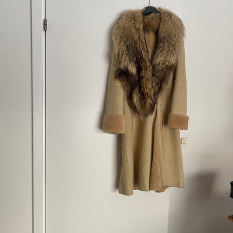 Pelsen er købt hos Club Collection for 3900 kr. Størrelse 40/medium. Kan lukkes til begge sider med en knap. Bindebælte. Længden er til lige under knæet. Gode stiklommer.
