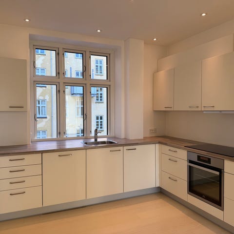Incl Thermex emhætte, ovn (Miele), De dietrich køleskab. Hvidevarerne er af ældre dato, men fungerer fint.