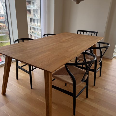 Fineste bordplade i olieret egefiner og ben i sortmalet MDF.