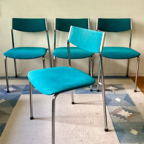 Meget holdbare stole. Kan stables. Røde plastsæder med hvide metalben. Mærker og slid på begge ben. Derfor den billige pris.