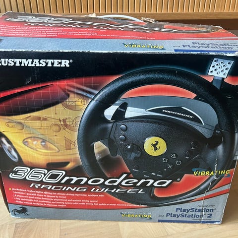 Til PlayStation 2 og PS one:Thrustmaster 360 Modena Racing Wheel med pedaler. Rattet har Ferrari-logo i midten og er designet til racingspil. Sættet inkluderer et rat og et pedal-sæt, der kan tilsluttes til kompatible spilsystemer. Sender gerne for købers regning.