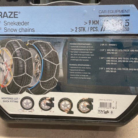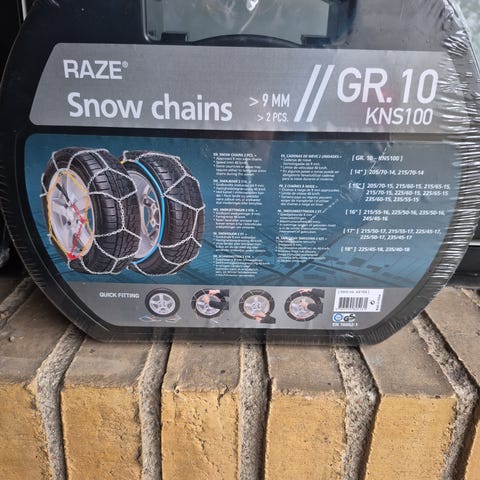 Raze Sneklæder med kæder i størrelse GR.8. Produktet består af sneklæder til montering på bilhjul for forbedret vejgreb på sne og is.