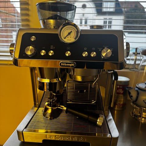 DeLonghi La Specialista Opera espressomaskine i rustfrit stål. Maskinen har flere knapper og drejeknapper til styring af brygning, et indbygget trykmålingsur og en integreret kaffekværn. Designet til at brygge espresso med præcis kontrol over brygningsprocessen.