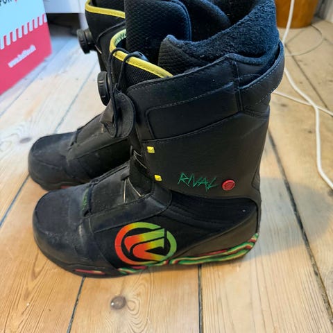 Flow snowboard med tilhørende bindinger og gule støvler str. 44.