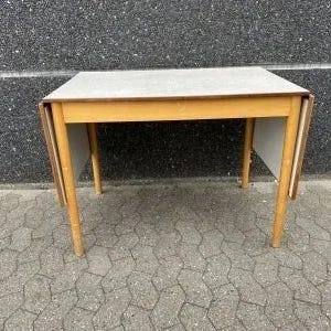 Super fint spisebord med sort formica overflade, egetræskant og stel i krom/sort. Måler 120 cm i diameter. Har lidt overfladeridser på toppen. Ca 15 år gammelt