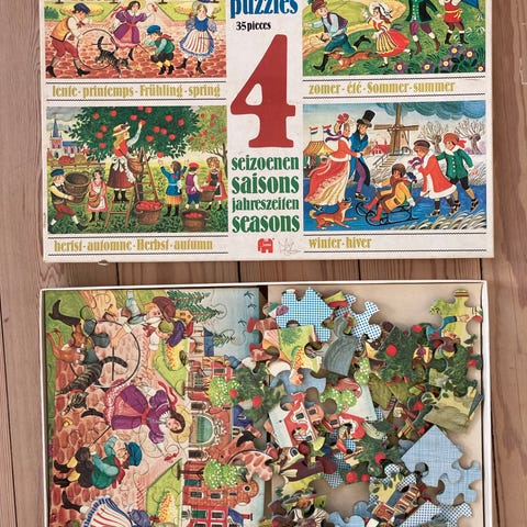 illustrerer forår, sommer, efterår og vinter. Puslespillet viser forskellige årstider og tilhørende aktiviteter og miljøer, velegnet til børn.