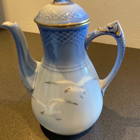 Mågestel kaffekande i porcelæn med fuglemotiv, flotte detaljer, produceret af Bing & Grøndahl (siden Royal Copenhagen).